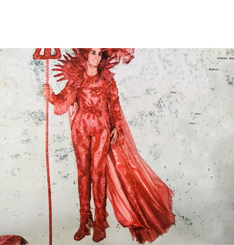 A fantasia foi toda bordada em alto-relevo, com chapéu tripartite e de chifre luminosos. Totalmente feita em pedrarias vermelhas, canutilhos, paetês franceses, capa em lamê metálico e chapéu de plumas. A capa tinha 10 metros, com vidrilhos e miçangas.